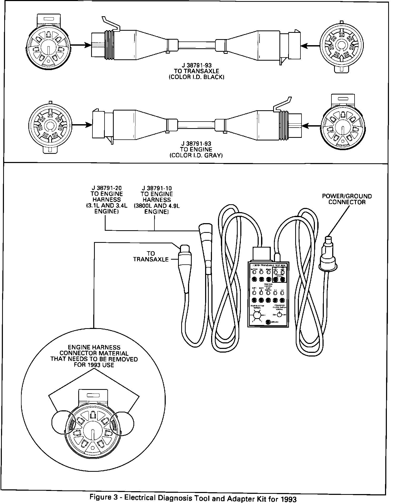 To diagnose a 1993 model vehicle using a Kent-Moore Transmission Test Box (J 38791), it will be necessary to modify the existing Kent-Moore adapter harness (J 38791-10 and/or J 38791-20) to accommodate the added alignment ribs. This can be done by removing the outer most radius of material, (pie). This will allow the added alignment ribs to penetrate. This modification would allow both previous and new style transaxle electric connectors to be accessed.