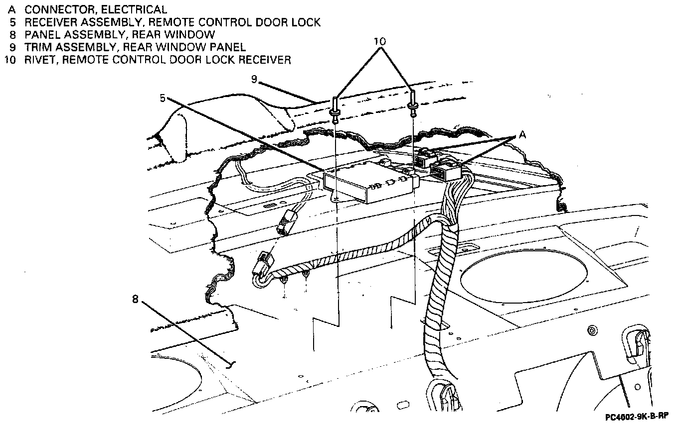 3. Rivets (10) attaching receiver assembly (5) to rear window panel assembly (8).