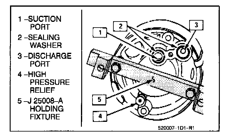 The Pressure Relief Valve, located in the compressor rear head casting. should only be replaced after recovering refrigerant. A new valve and O-ring coated with 525 viscosity refrigerant oil should be installed.