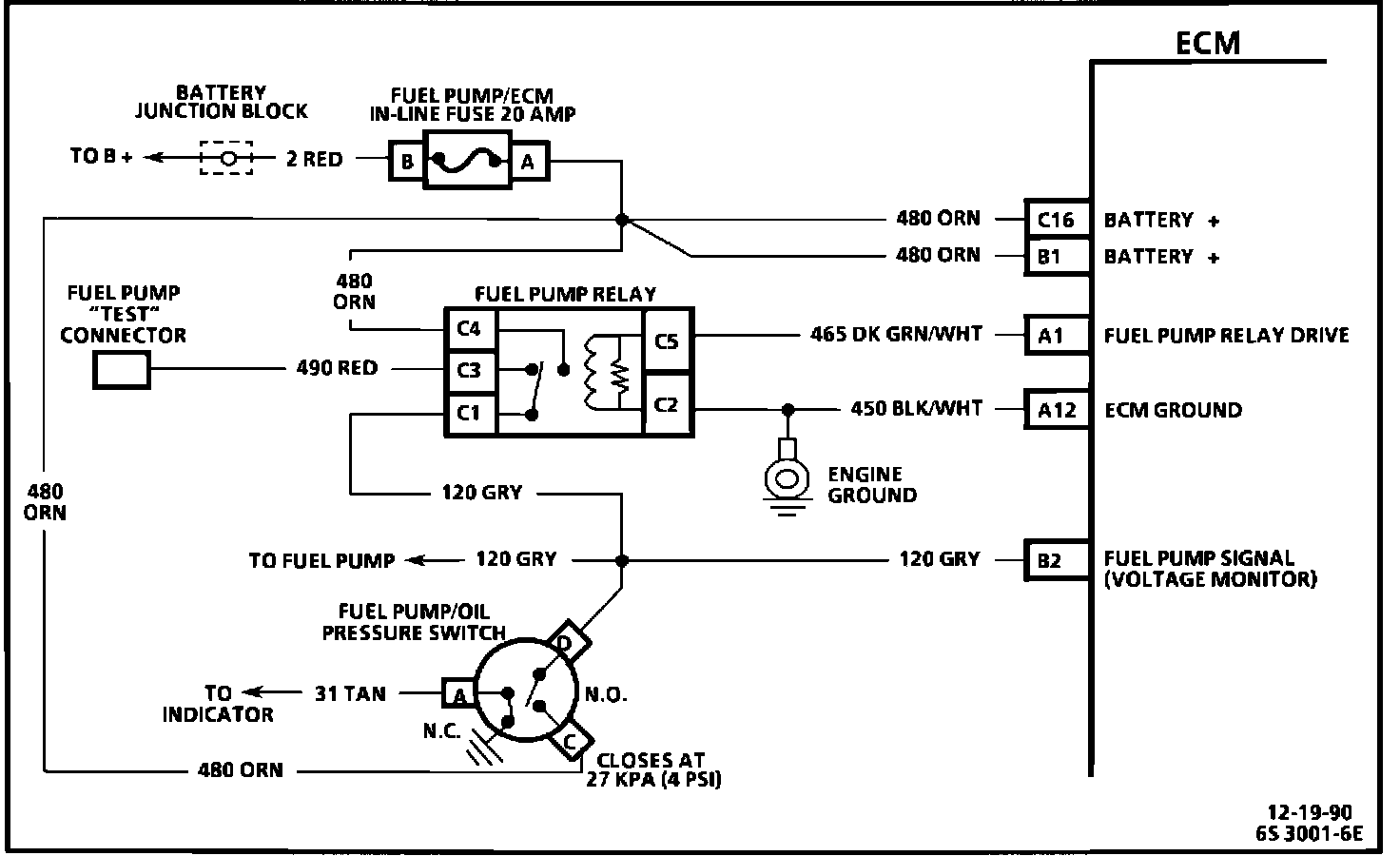When the ignition switch is turned to the "ON" position, the ECM will activate the in-tank fuel pump. The fuel pump will operate as long as the engine is cranking or running, and the ECM receives an ignition reference pulse. If no ignition reference pulses exist, the ECM will shut off the fuel pump within 2 seconds after the ignition is turned "ON." The fuel pump will supply fuel to the TBI unit where the pressure is controlled from 9 to 13 psi (62 to 90 kPa) by the pressure regulator. Excess fuel is then returned to the fuel tank. When the engine is stopped, the pump can be energized by applying battery voltage to the fuel pump test terminal. See LOCATIONS/COMPONENTS/UNDERHOOD BLOCK DIAGRAMS for the proper location of the test terminal.