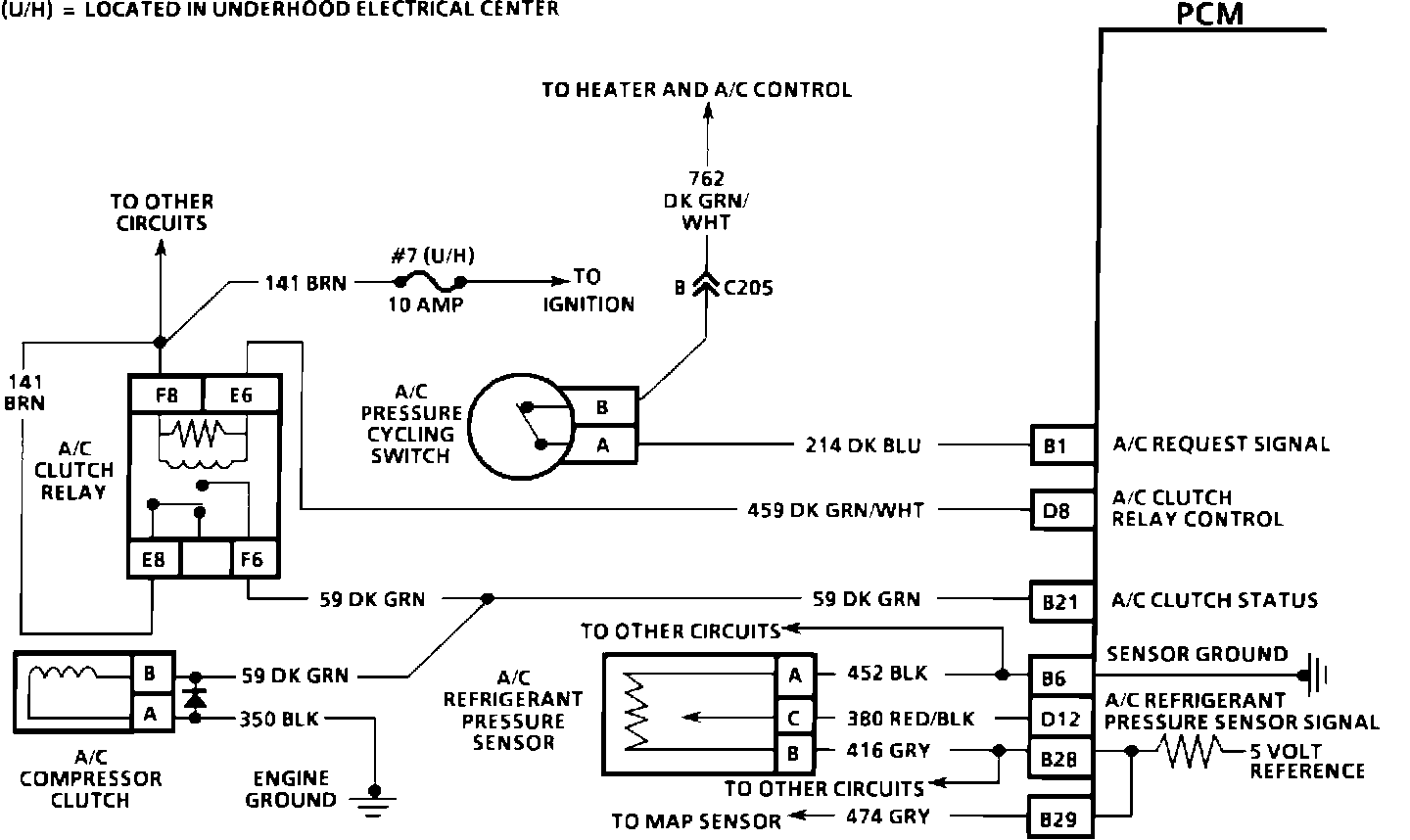 When the PCM detects that A/C has been requested, it supplies a ground signal to the coil inside the A/C relay. The switch portion of the relay is now operated, energizing the A/C compressor clutch.