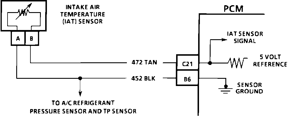 Low intake air temperature produces a high resistance, while high intake air temperature produces a low resistance. The PCM supplies a 5.0 volt signal to the sensor through a resistor and measures the voltage. By measuring the voltage, the PCM can determine Intake Air Temperature.