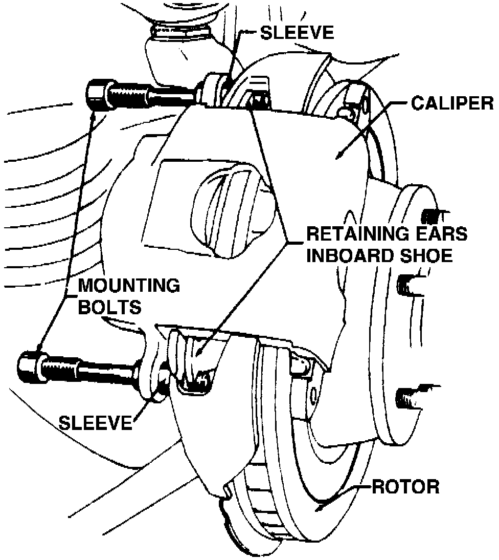 2. Start mounting bolts through sleeves in inboard caliper ears and mounting bracket, making sure ends of bolts pass under ears on inboard shoe. Right and left calipers must not be interchanged.