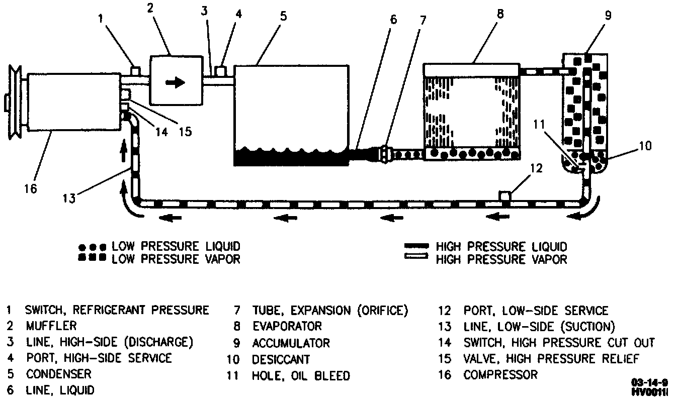 A muffler is placed in the compressor high-side (discharge) line to reduce compressor noises and line vibrations. The muffler is an integral part of the suction/discharge refrigerant hose assembly which must be replaced in order to replace the muffler. The muffler should only be replaced if an internal blockage is detected.