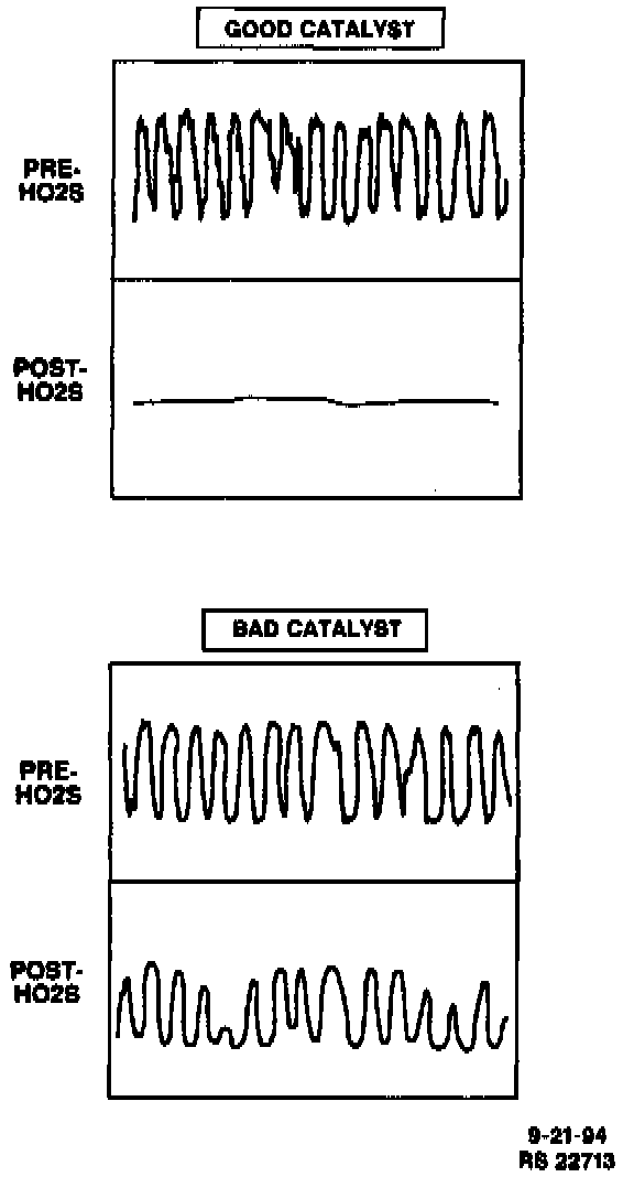 The Three-Way catalyst (TWC) must be monitored for efficiency. To accomplish this, the control module monitors the pre- and post-catalyst oxygen sensors. When the TWC is operating properly, the post-catalyst (2) oxygen sensor will have significantly less activity than the pre-catalyst (1) oxygen sensor. The TWC stores and releases oxygen as needed during its normal reduction and oxidation process. The control module will calculate the oxygen storage capacity using the difference between the pre catalyst and post catalyst oxygen sensor's voltage levels. If the activity of the post- catalyst oxygen sensor approaches that of the pre-catalyst oxygen sensor, the catalysts efficiency is degraded.