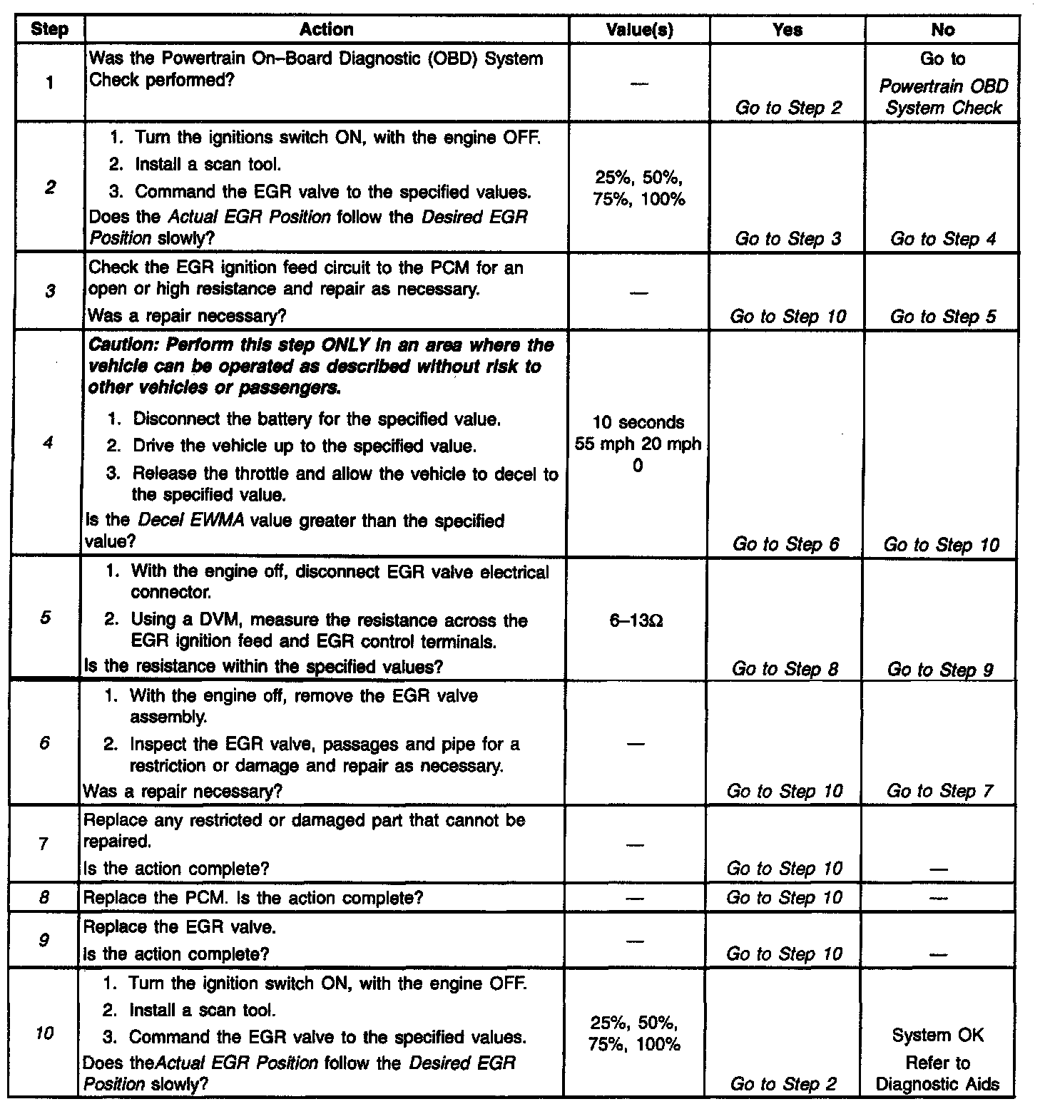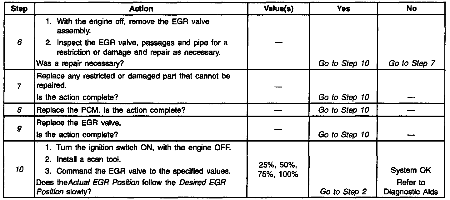The EGR system is monitored by the PCM in order to detect when a failure occurs that causes emission levels to rise more than one and one-half times normal levels. If the PCM detects that a system failure has occurred due to a restriction, a DTC P0401 will be set. If the PCM detects that it cannot control the EGR valve as it has commanded, a DTC P1406 is set. Exhaust Gas Recirculation (EGR) System Diagnostic will check normal operation of the EGR system. Refer to the applicable table for diagnosis.