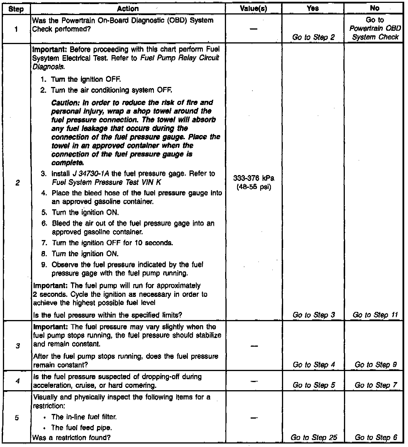 15. A lean condition may result from the fuel pressure being below 333 kPa (48 psi). A lean condition may cause a DTC PO131 or a DTC PO171 to set. Driveability conditions associated with lean conditions can include hard starting (when the engine is cold), hesitation, poor driveability, lack of power, surging, and misfiring.
