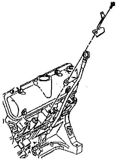 f. Install the oil level indicator assembly retaining bolt. Tighten the oil level indicator assembly retaining bolt to 25 Nm (18 ft. lbs.).
