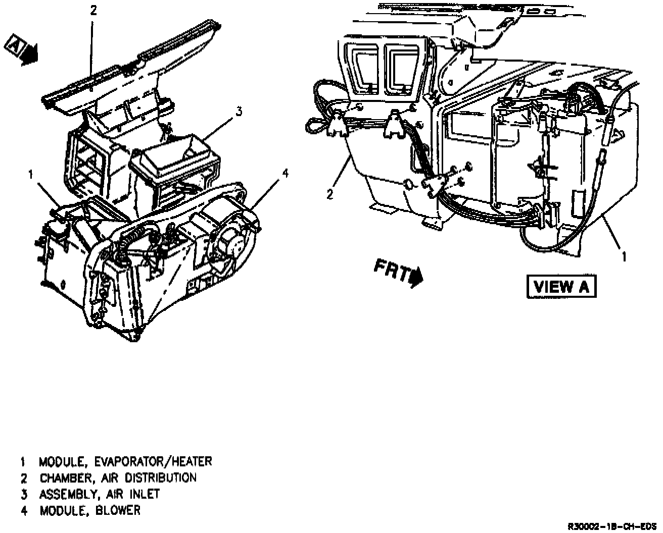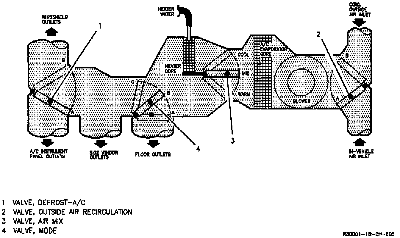 Air utilized by the HVAC system is drawn into the blower module through the air inlet assembly at the base of the windshield and routed through the blower. The blower forces the air through either the evaporator core where it is dehumidified and cooled, or through the heater core, where it is warmed. Now conditioned, the air is directed by air valves in the A/C module to the outlets in the instrument panel, to the heater outlets at the floor, front and rear, or to the defroster outlets, depending upon the mode selected by the driver.