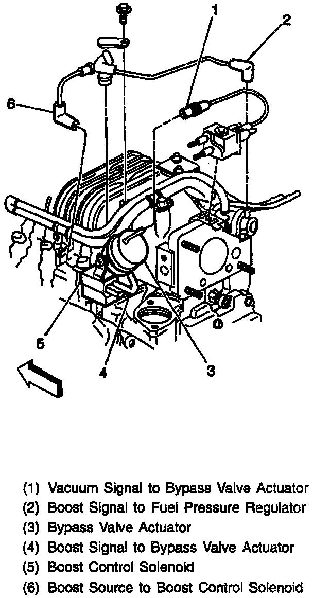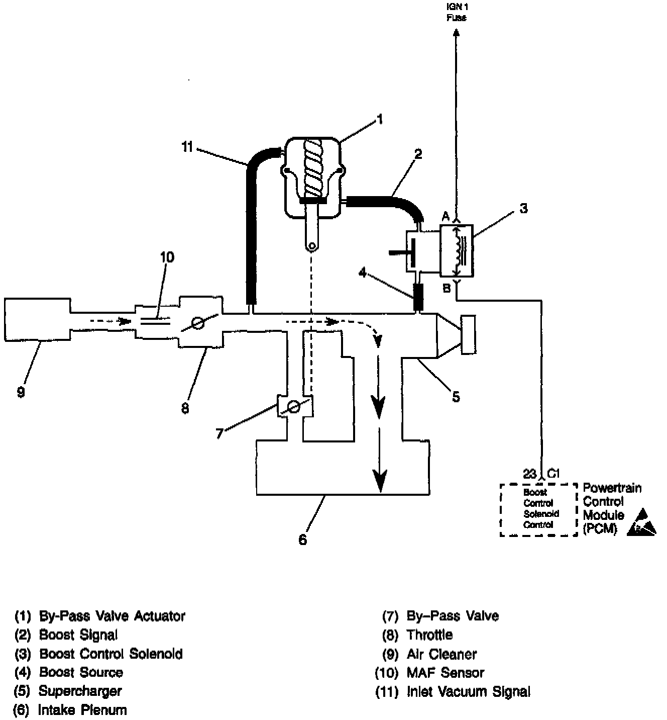 Under most conditions, the PCM commands the boost control solenoid to operate at a 100% duty cycle (ON) to allow full boost pressure upon demand. However, it reverse gear is selected or the PCM detects rapid deceleration or engine load is extremely high, reduced boost pressure is desired. Under these conditions, the PCM commands the boost control solenoid to operate at a 0% duty cycle (OFF), which opens the bypass valve. With the Bypass valve open, boost pressure is reduced by recirculating intake air back through the supercharger inlet.