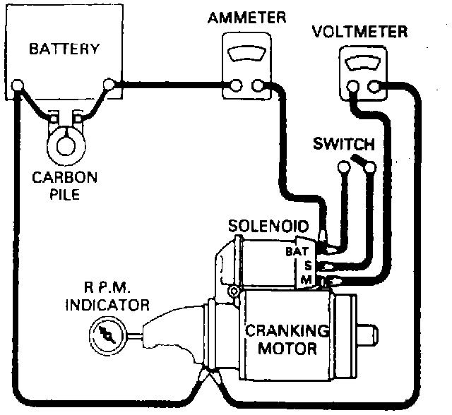 2. Turn switch on and adjust carbon pile load to the specified voltage (refer to "Specifications"). Read current draw on ammeter and pinion speed on RPM indicator. Turn off carbon pile and open switch. Compare readings to test specifications (refer to "Specifications").