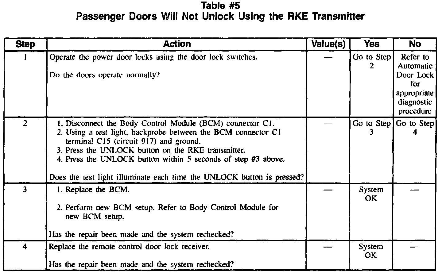Table #5 Passenger Doors Will Not Unlock Using The RKE Transmitter: