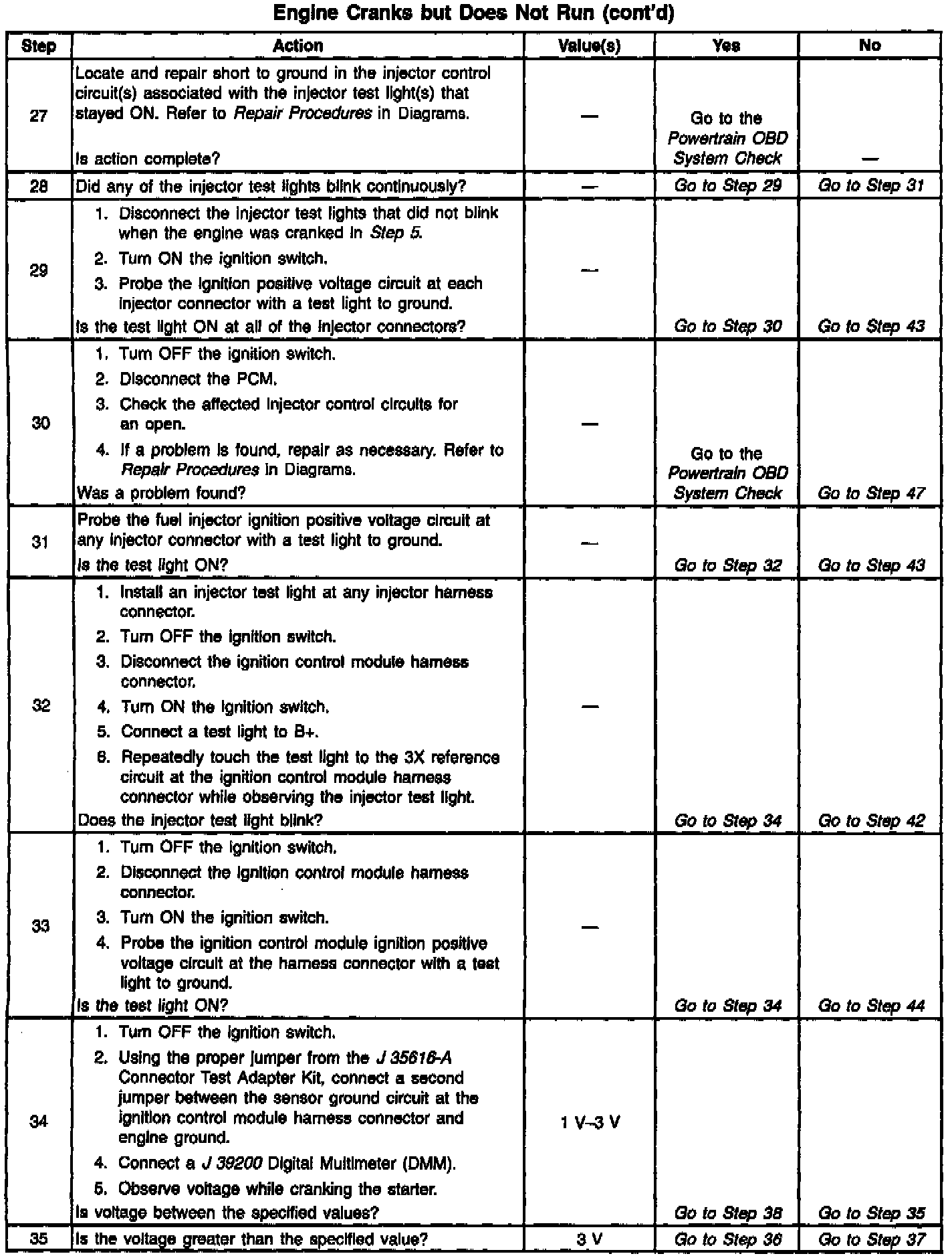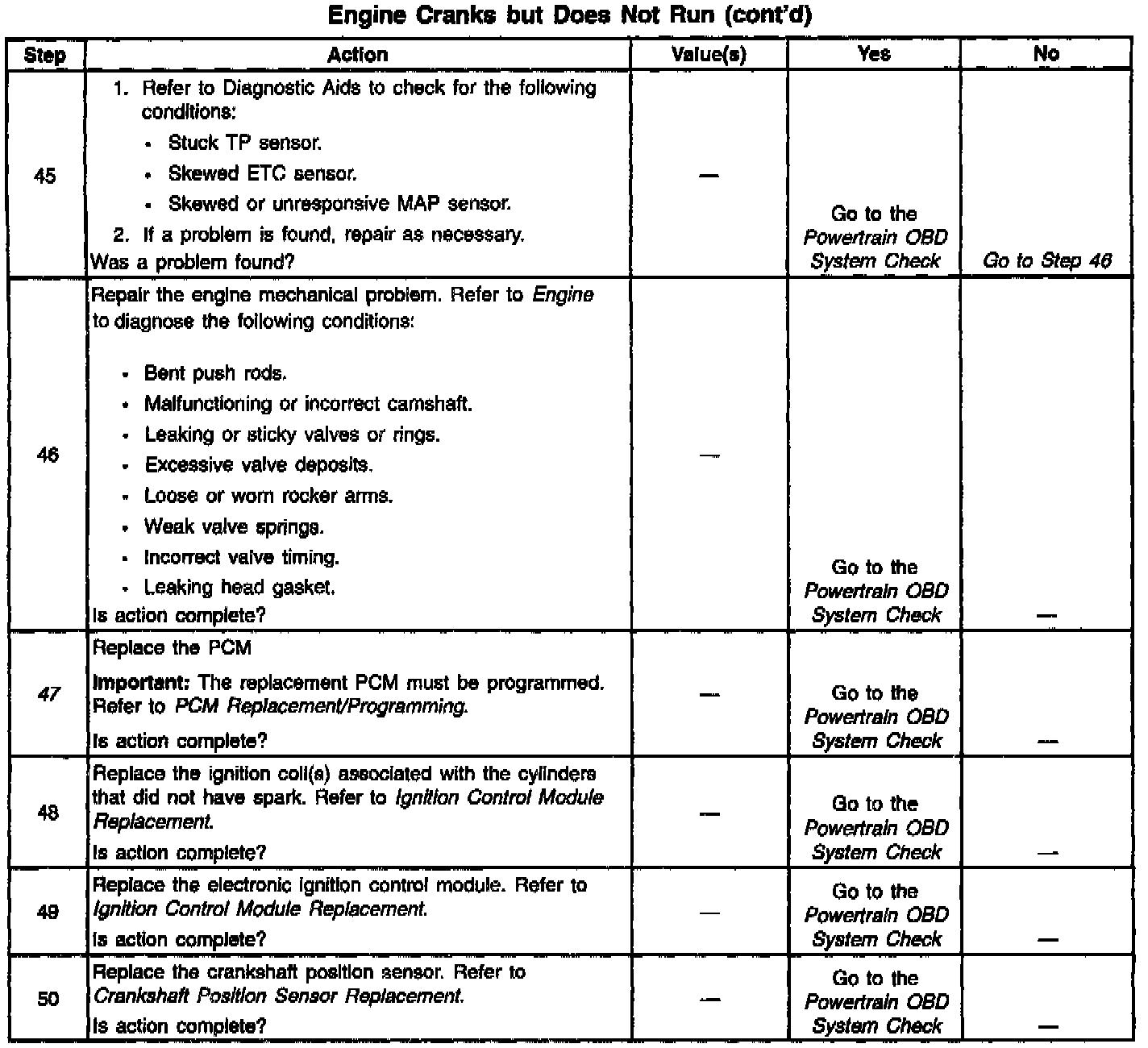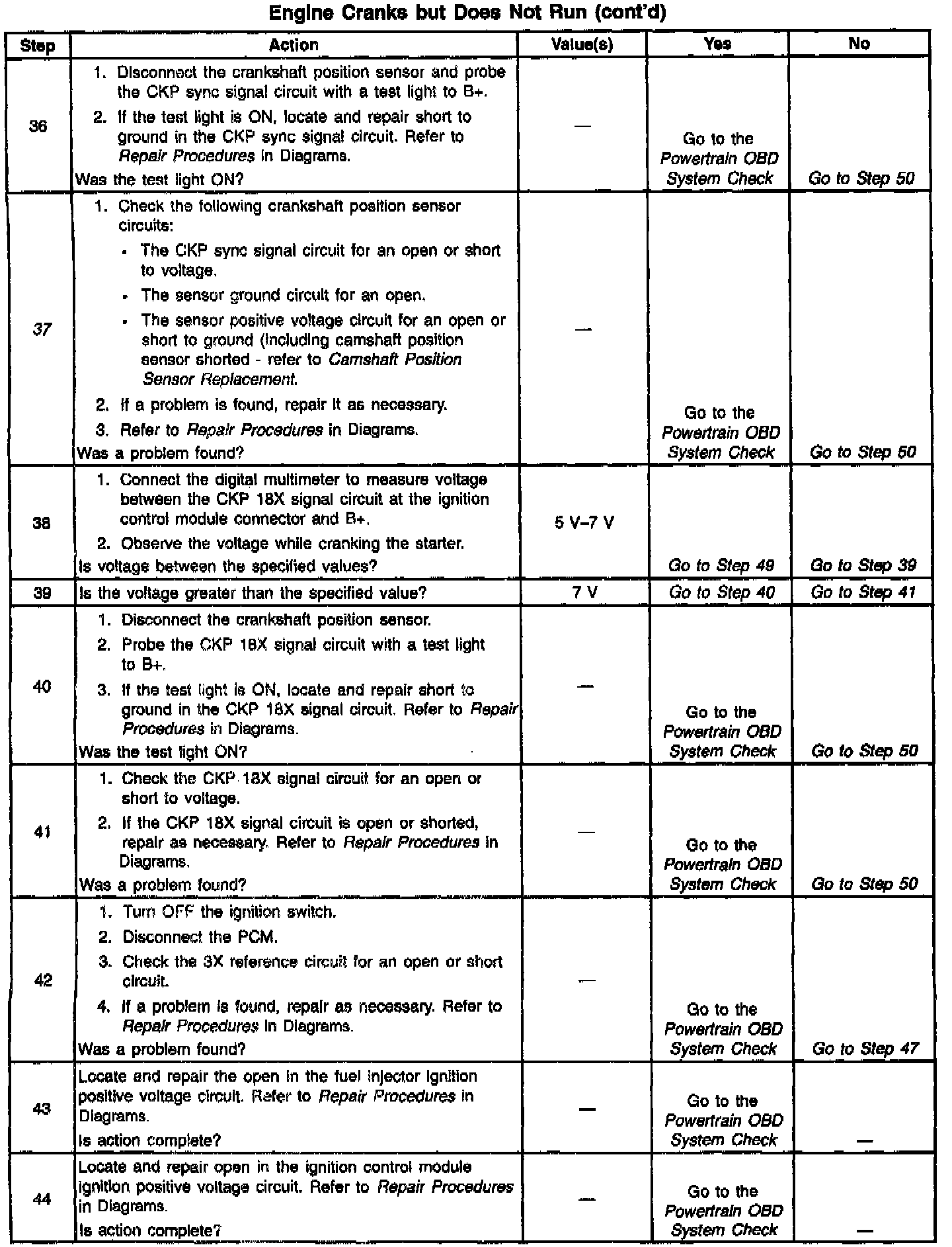 37. An internally shorted camshaft position sensor can cause an engine cranks but will not run condition. If the diagnostic table indicates a short to ground in the sensor ignition positive voltage circuit, disconnect the camshaft position sensor and attempt to start the vehicle. If the vehicle starts with the camshaft position sensor disconnected, a shorted camshaft position sensor is indicated.