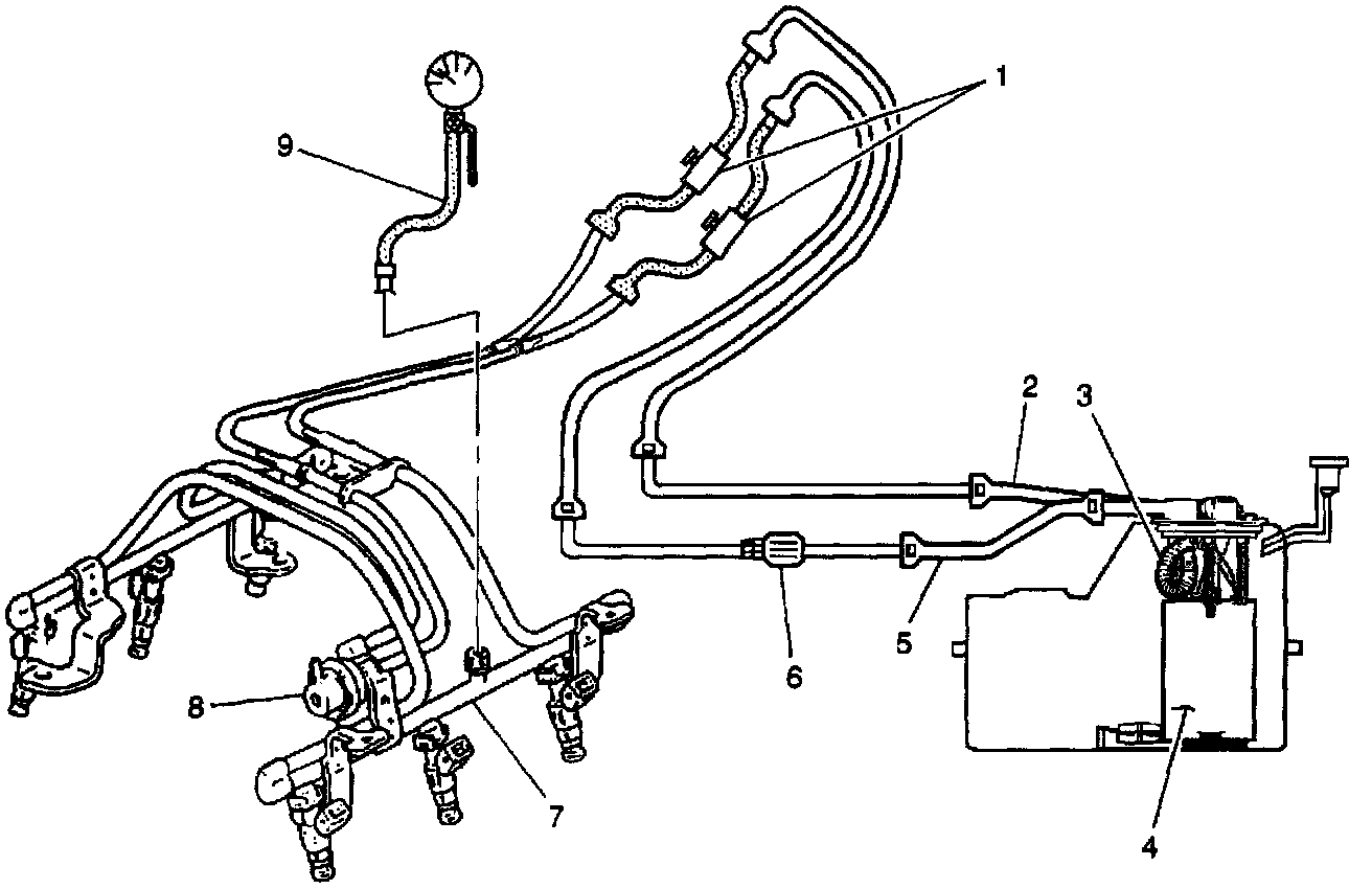 A fuel pressure regulator (8), attached to the Fuel flail, keeps the fuel available to the fuel injectors at a regulated pressure. Unused fuel is returned to the fuel tank by a separate fuel return pipe (2). The fuel pump flex pipe (3) functions as a conduit for transporting pressurized fuel from the fuel pump to the above cover fuel feed pipe. The fuel pump flex pipe also eliminates fuel pump generated pressure pulse noise, and eliminates clamps formerly needed for rubber hoses or nylon pipes. The Fuel pressure gauge (9) J 34730-1A and fuel pipe shut off adapters (1) J 37287 are used for fuel system diagnosis.