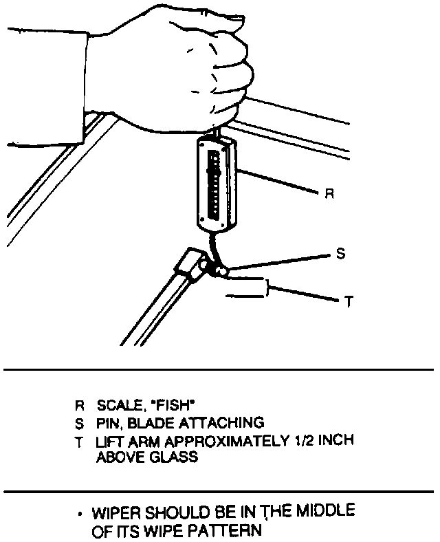 3. Attach a scale to wiper arm attaching pin and measure the force required to lift wiper arm perpendicular to windshield to a normal working height (height with blade assembly attached).
