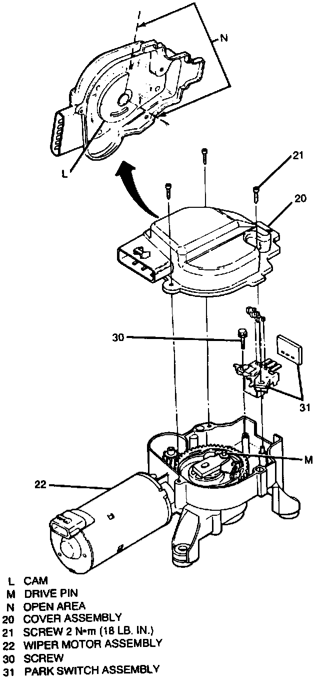 3. Screw (30) and park switch assembly (31) from wiper motor assembly (22).