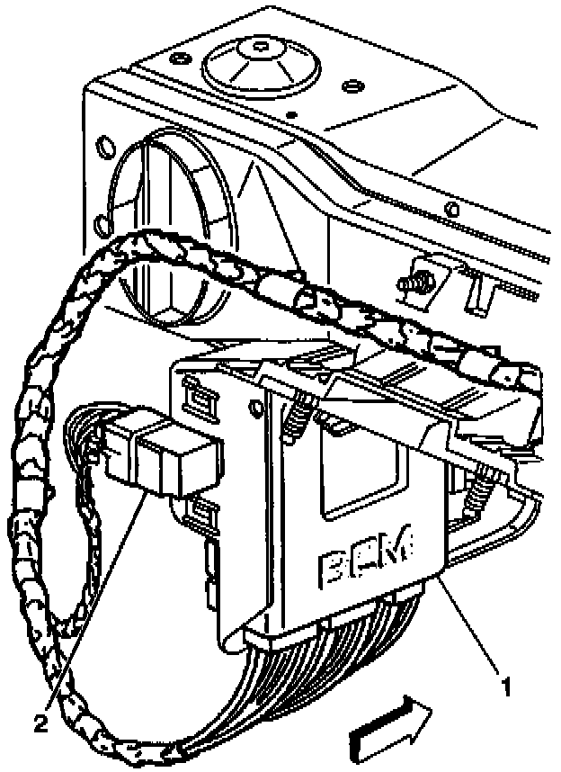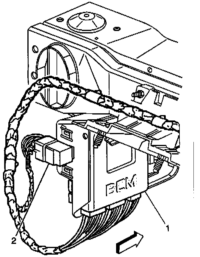 2. Slide the electronic brake control relay (2) into the EBCM/EBTCM bracket (1) until the electronic brake control relay is secure.