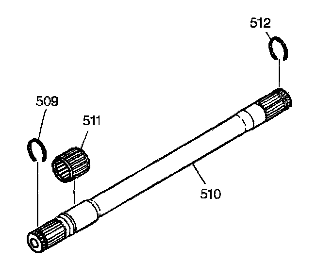 1. Install the drive axle retainer ring (509) and the output shaft differential inboard snap ring (512) onto the output shaft (510).
