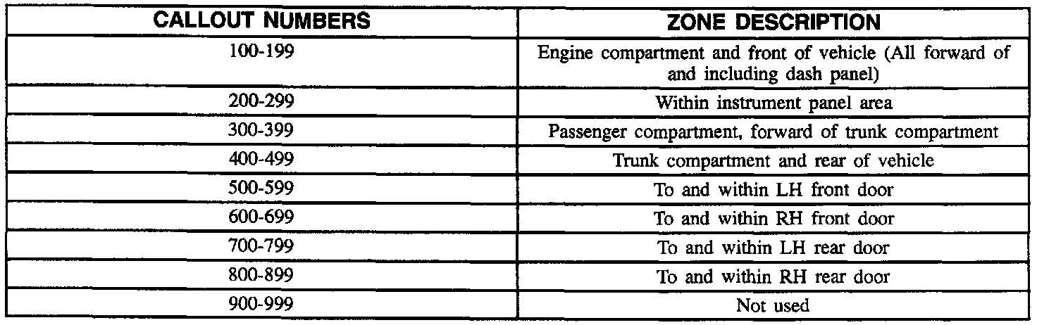 All grounds, in-line connectors, pass-through grommets and splices are given identifying numbers according to where they are located in the vehicle. The above chart explains the numbering system.
