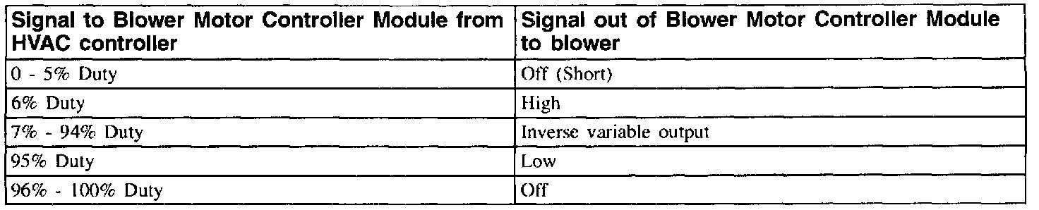 The blower motor controller module contains solid state circuitry which utilizes a pulse width voltage signal (at a given duty cycle), from the control head and returns an inverse pulse width signal to the blower motor see illustration. The control head pulse width signal is based on the user set temperature, outside air temperature, in vehicle temperature and solar sensor. For example, if the in vehicle temperature is much colder or hotter than the user set temperature, and the AUTO button has been selected, the blower motor controller module will control the blower from a high speed to a low speed as the difference in set temperature and in vehicle temperature decreases.