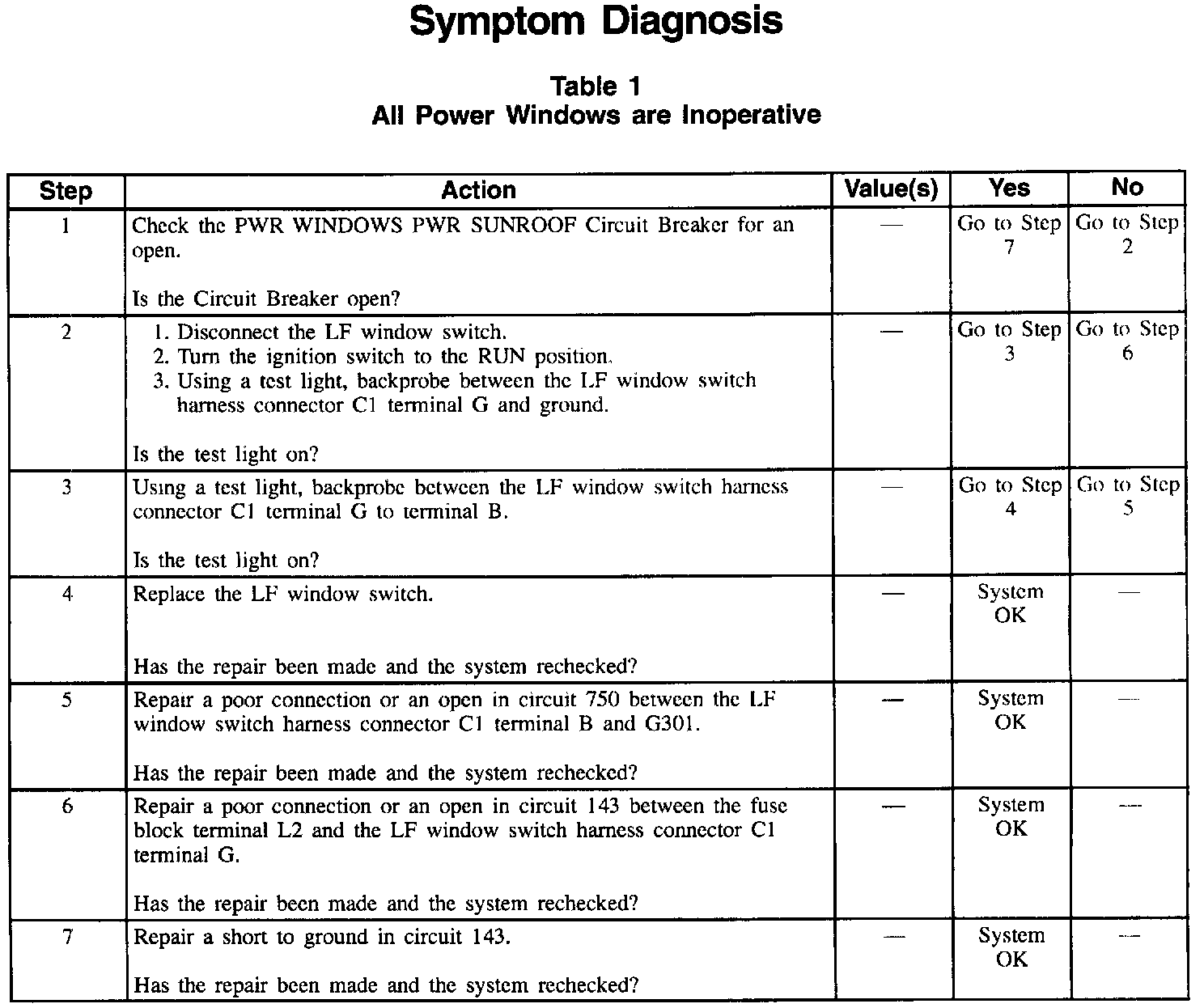 Table 1: All Power Windows Are Inoperative