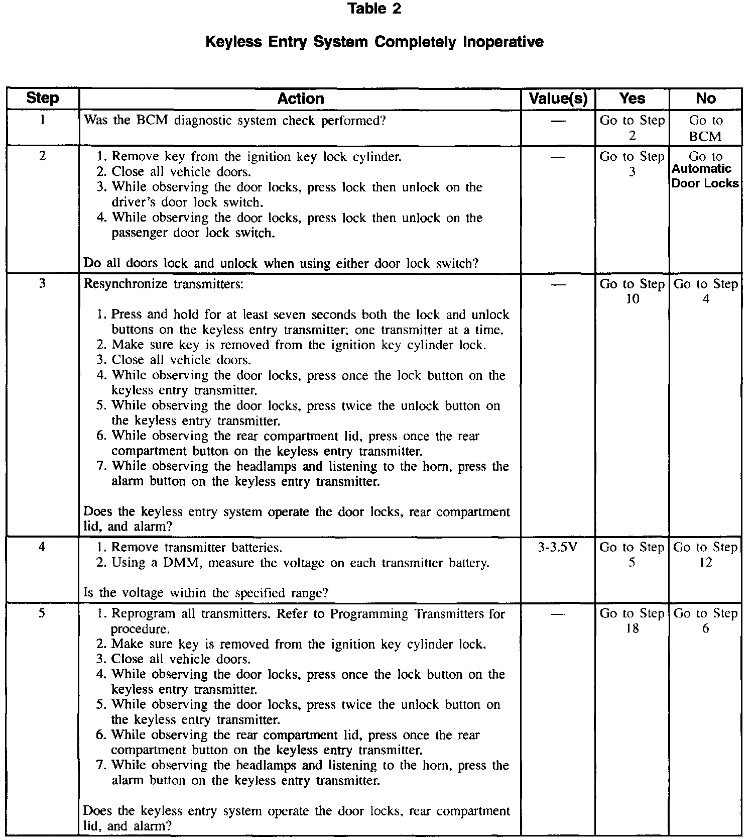 Table 2 Keyless Entry System Completely INOP