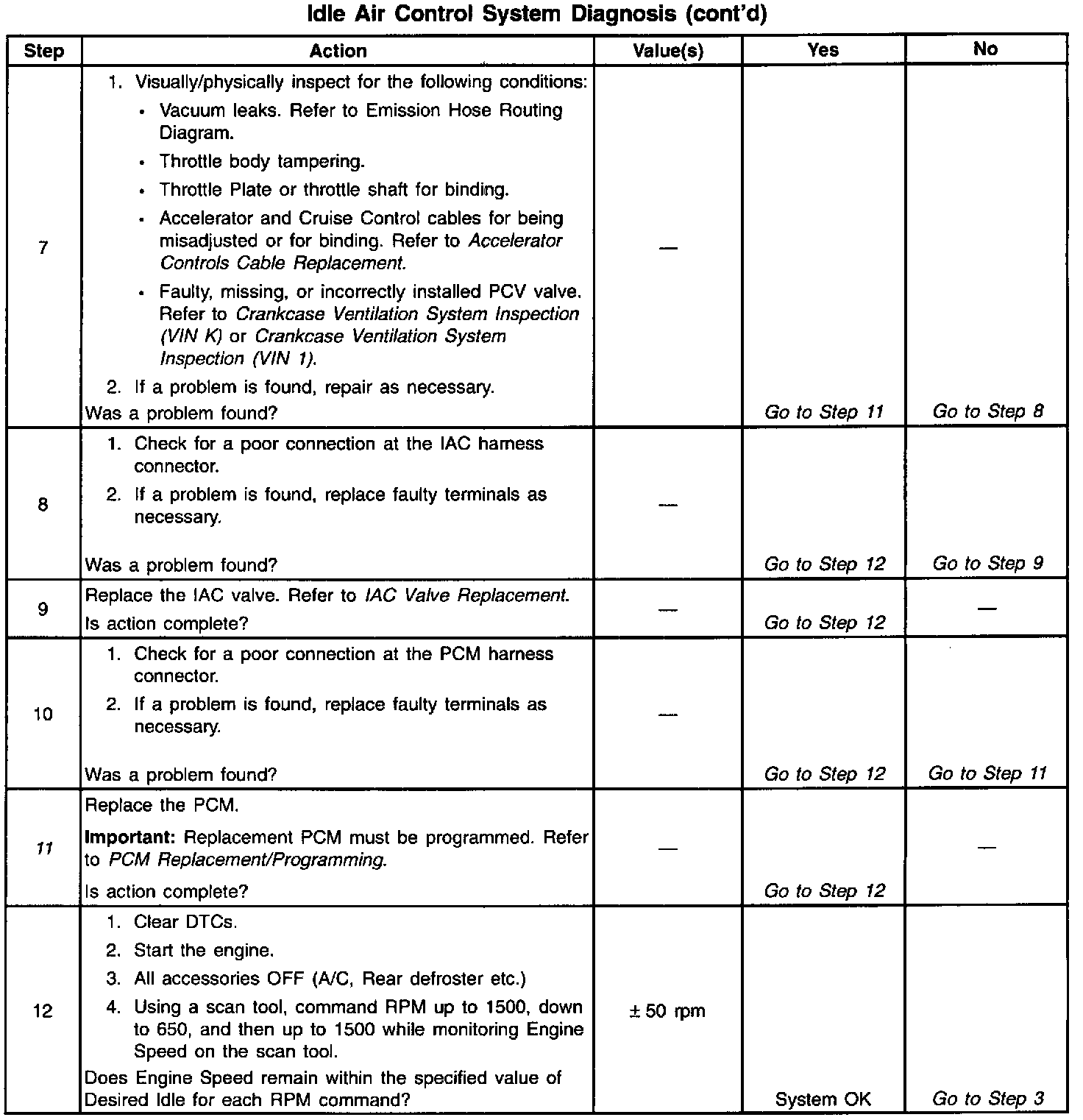 Check for a sticking throttle plate. Also inspect the IAC passage for deposits or objects which will not allow the IAC pintle to fully extend. Vacuum leak. Check for a condition that causes a vacuum leak, such as disconnected or damaged hoses, leaks at EGR valve and EGR pipe to intake manifold, leaks at throttle body, faulty or incorrectly installed PCV valve, leaks at intake manifold brake booster hose disconnected, etc.
