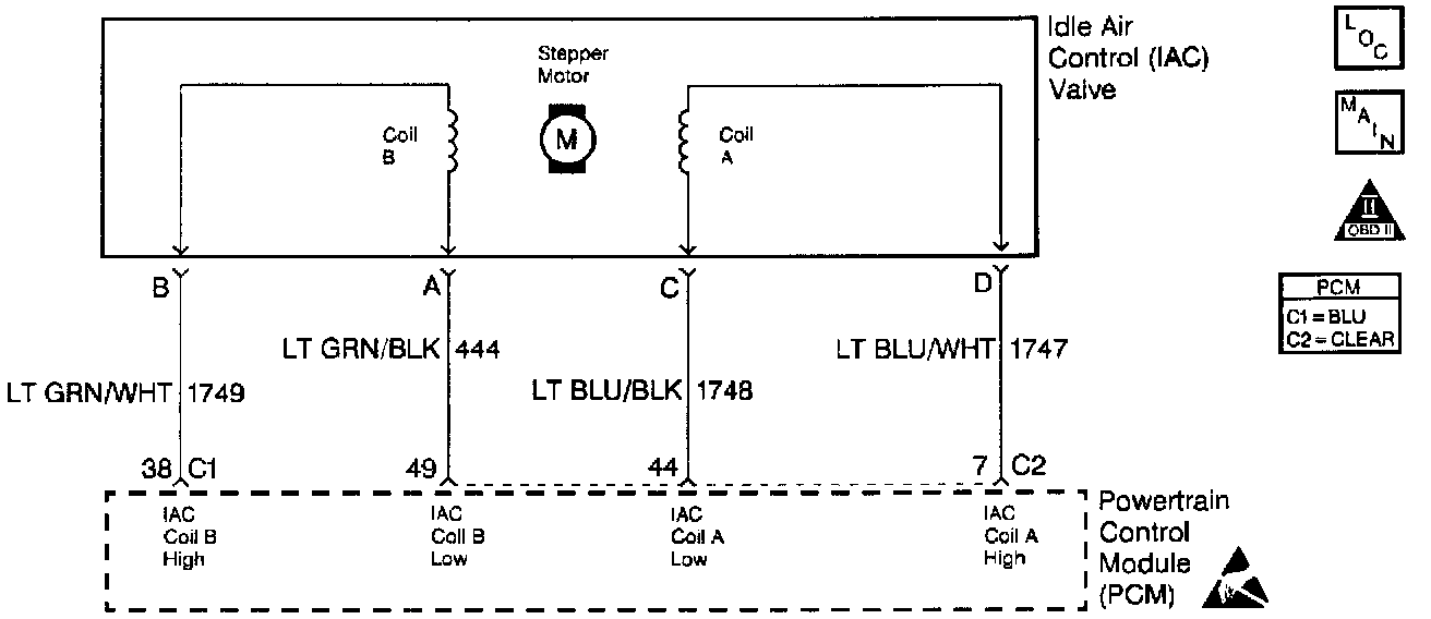 ^ Poor connection at PCM or IAC motor. Inspect harness connectors for backed out terminals, improper mating, broken locks, improperly formed or damaged terminals, and poor terminal to wire connection.