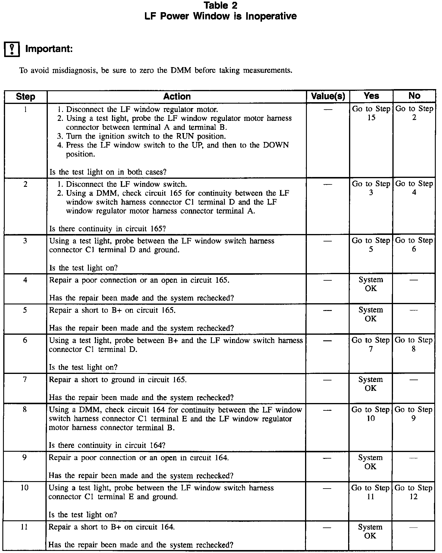 Table 2: LF Power Window Is Inoperative