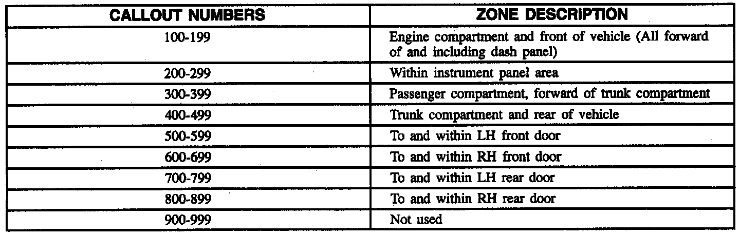 All grounds, in-line connectors, pass-through grommets and splices are given identifying numbers according to where they are located in the vehicle. The above chart explain the numbering system.