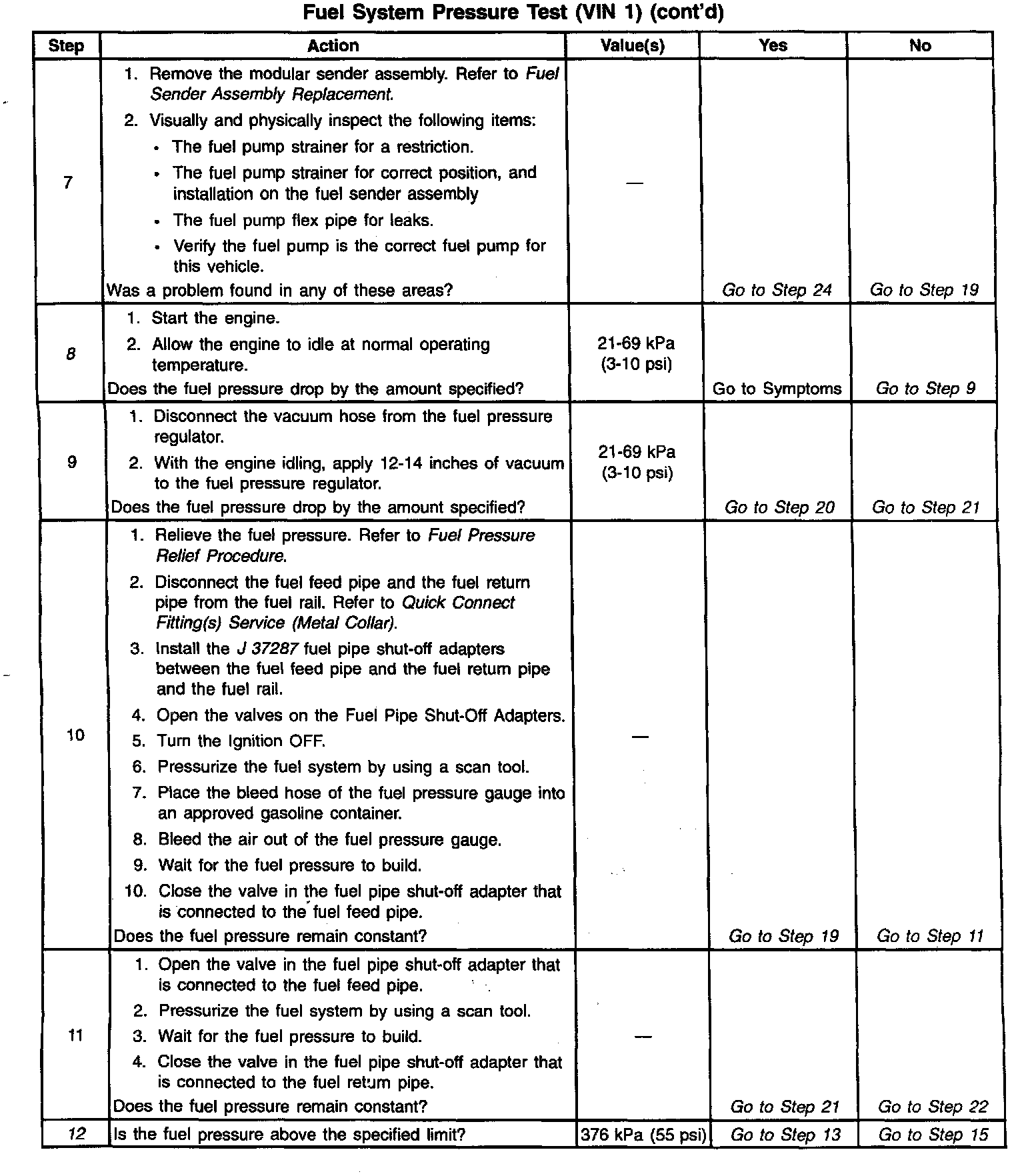 16. Restricting the fuel return pipe with the Fuel Pipe Shut-Off Adapter Refer to J 37287 causes the fuel pressure to rise above the regulated fuel pressure. Using a scan tool to pressurize the system, the fuel pressure should rise above 376 kPa (55 psi) as the valve on the Fuel Pipe Shut-Off Adapter connected to the fuel return pipe becomes partially closed.