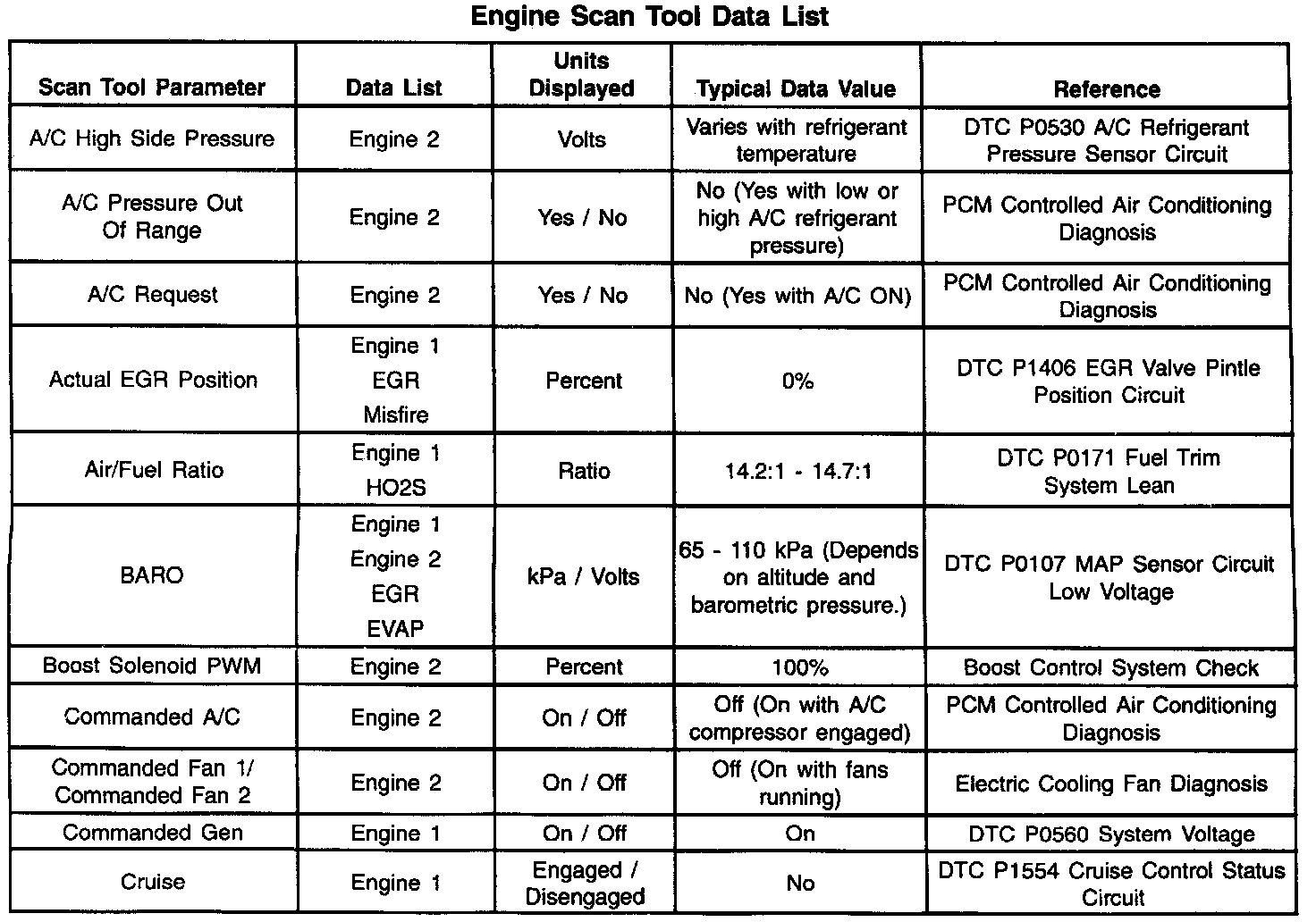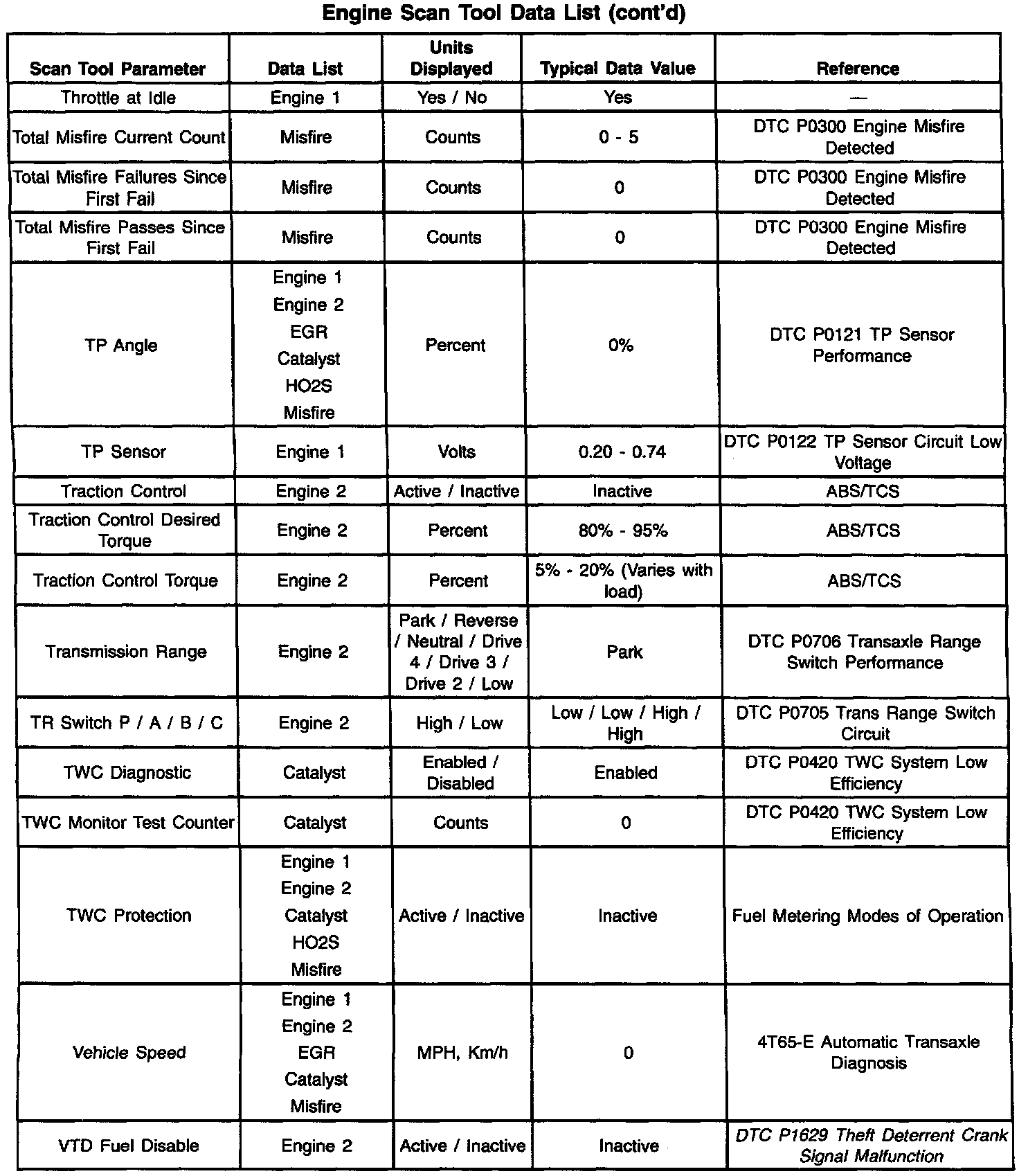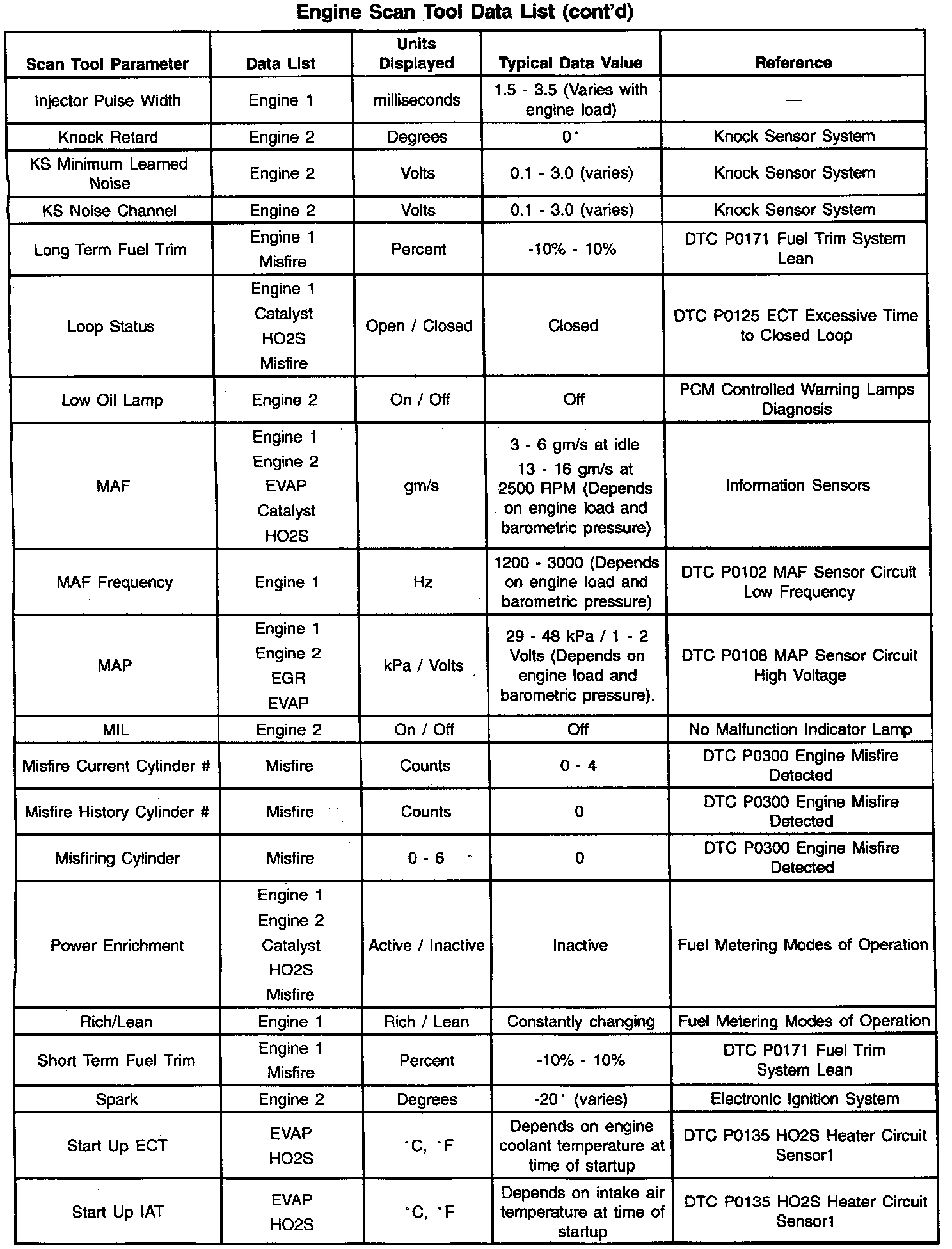 Only the parameters listed below are referred to in this database for use in diagnosis. For further information on using the scan tool to diagnose the PCM and related sensors, refer to the applicable reference section listed below. If all values are within the typical range described below, refer to Symptoms section for diagnosis. The Typical Scan Data Values table contains all the parameters included in the following data lists arranged in alphabetical order: