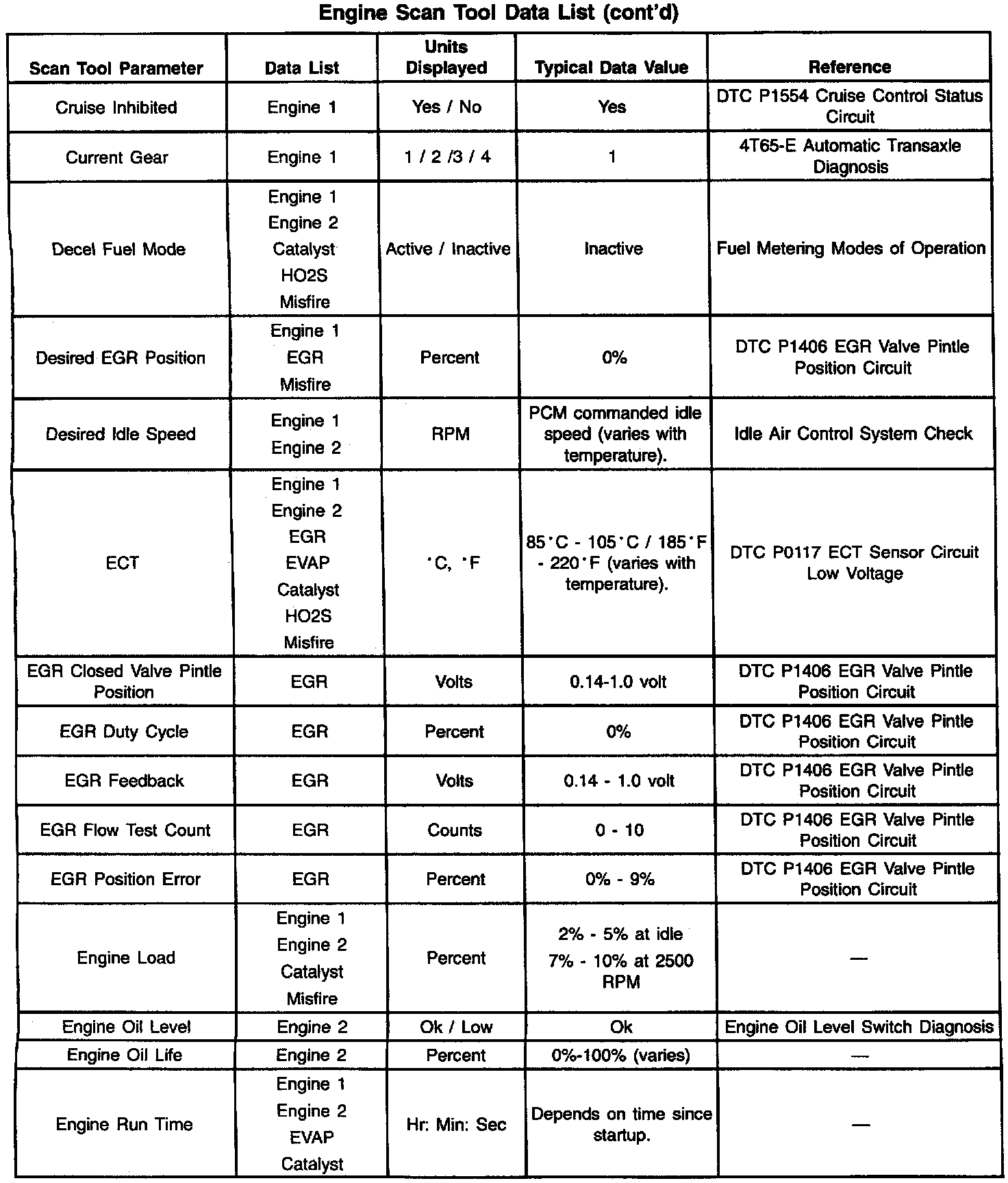 ^ EGR - Contains information specific to the Exhaust Gas Recirculation system flow diagnostics and the EGR valve pintle position sensor diagnostics. Also displays parameters required to verify proper EGR system operation.