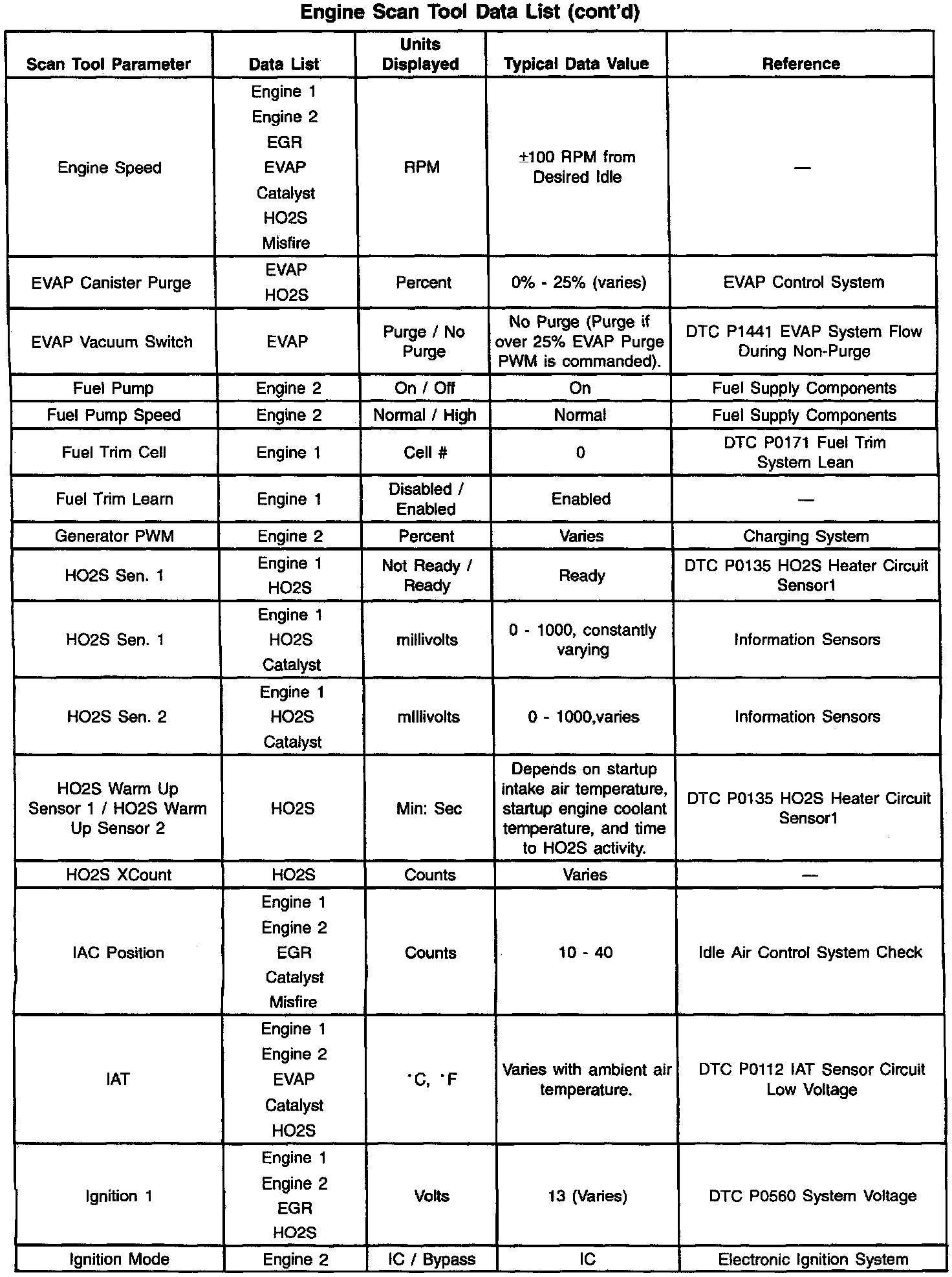 Use the Typical Scan Data Values table only after the Powertrain On-Board Diagnostic System Check has been completed, no DTC(s) were noted and you have determined the on-board diagnostics are functioning properly. Scan tool values from a properly running engine may be used for comparison with the engine you are diagnosing. The Typical Scan Data values represent values that would be seen on a normally running engine.