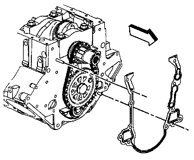 2. Install the engine front cover. Align the cogs on the crankshaft sprocket with the cogs on the oil pump in the engine front cover.