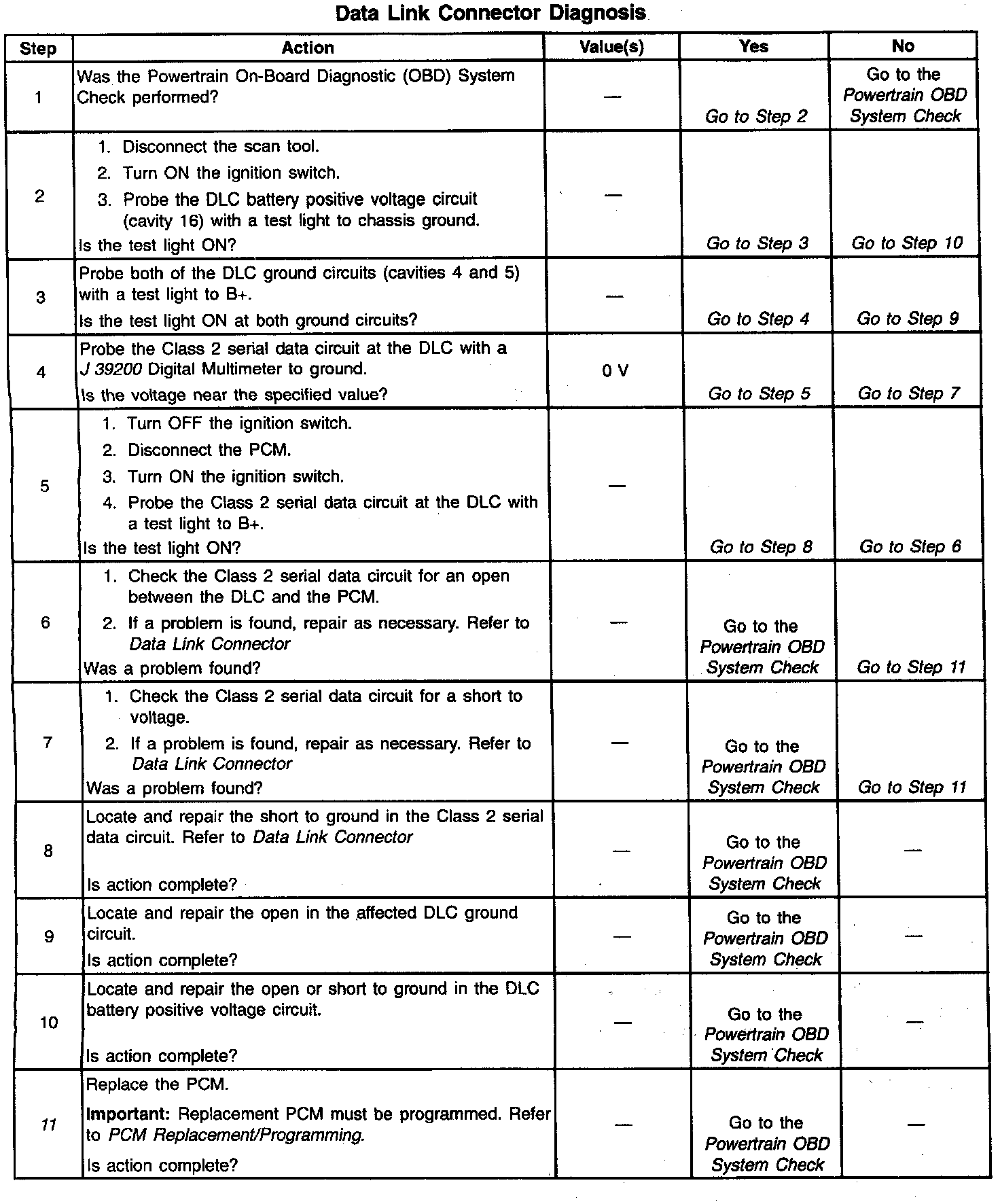 The Class 2 serial data circuit to the DLC allows bi-directional communication between the PCM and the scan tool. If communication between the scan tool and the PCM cannot be established, the procedure in the DLC Diagnosis table should be used to diagnose the condition.