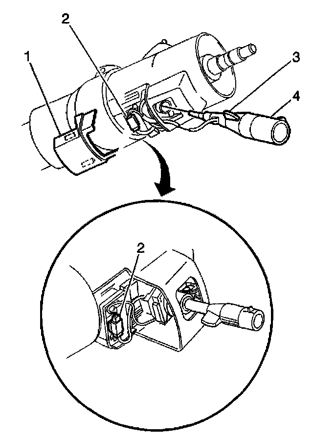 3. Disconnect the cruise control wiring connector (2). Note the position of the connector installed in the column.