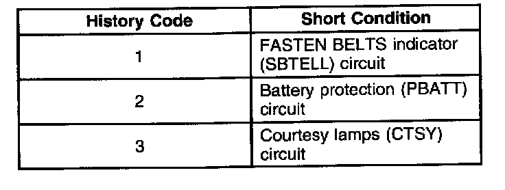 Upon entering the diagnostic mode, the MALL module provides audible feedback in the form of bongs; the number of bongs represents the stored history code number. The FASTEN BELTS indicator flashes with each bong. In the following chart, the history code is listed with the corresponding short circuit condition:Body Control Module Diagnostic Information: