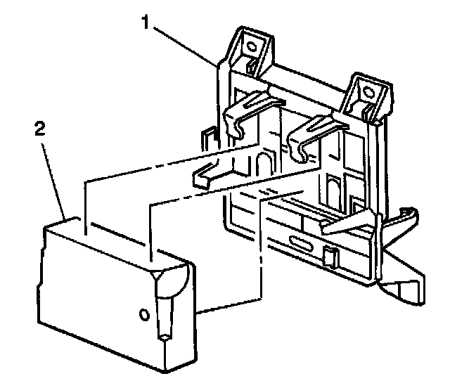 3. Remove the body control module (2). Spread the latch tabs on the sides of the bracket (1) while pulling downward, remove from mounting bracket.
