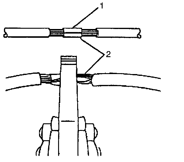 7. Center the splice clip (2) over the stripped wires (1) and hold the clip in place.