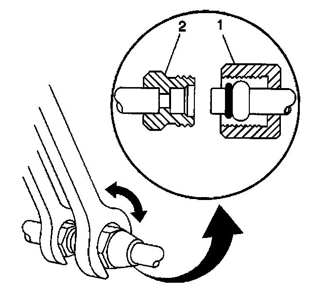 7. For compression-style fittings; use a back-up wrench on the A/C refrigerant component (smaller size) fitting (2), then tighten the A/C refrigerant hose (larger size) fitting (1) to specification.