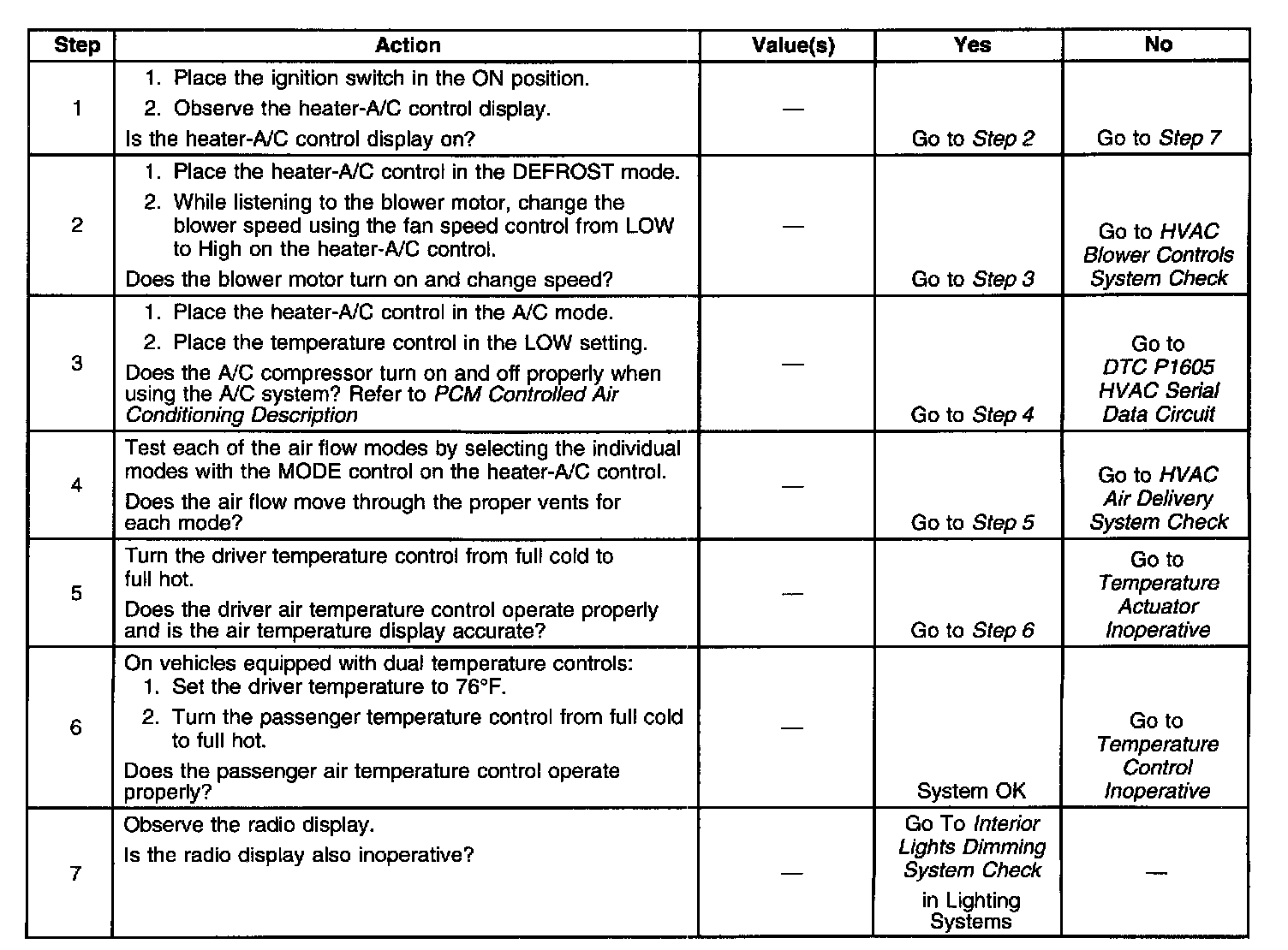 ^ Inspect for temperature change when the temperature knob position is changed. On dual control systems Inspect the left side and right side outlets when the temperature control position is changed.
