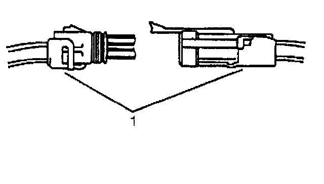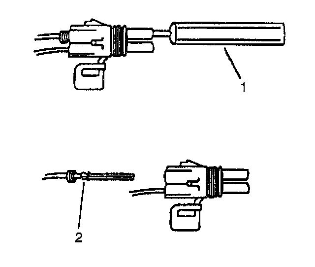 ^ Insert the Weather Pack (R) terminal removal tool into the front (mating end) of the connector cavity until it rests on the cavity shoulder (1).