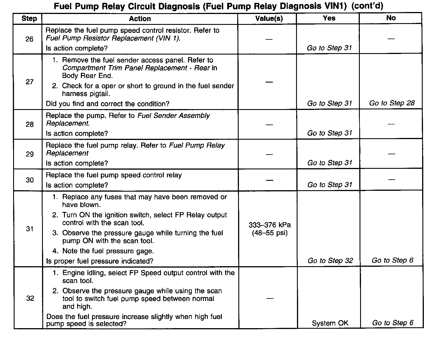 When the Ignition switch is first turned ON, the PCM energizes the fuel pump relay which applies power to the fuel pump through the high speed circuit (controlled by the fuel pump speed control relay). The fuel pump relay will remain ON as long as the engine is running or cranking and the PCM is receiving reference pulses. If no reference pulses are present, the PCM de-energizes the fuel pump relay within 2 seconds after the ignition is turned ON or the engine is stopped. The fuel pump delivers fuel to the fuel rail and injectors, then to the fuel pressure regulator. The fuel pressure regulator controls fuel pressure by allowing excess fuel to be returned to the fuel tank. With the engine stopped, the fuel pump can be turn ON by using the scan tool output controls function.