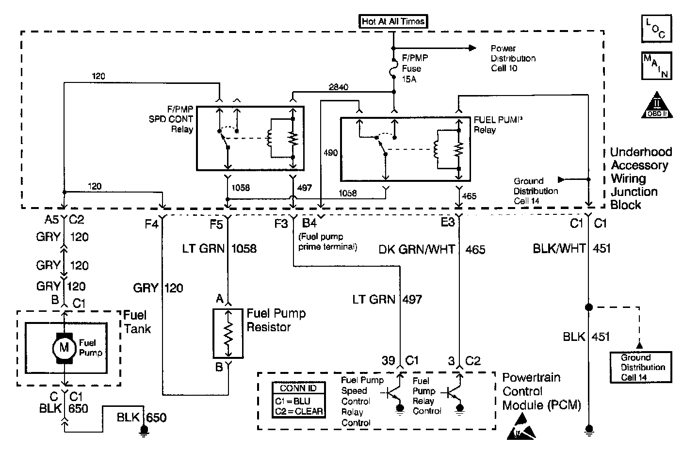 The PCM alters fuel pump speed by energizing the fuel pump speed control relay Under normal conditions, the fuel pump control speed control relay is energized (normal fuel pump speed). The applied voltage to the fuel pump is controlled by a resistor assembly. When higher fuel volume is required due to increased engine load (MAP sensor value over 90 kPa). the PCM de-energizes the fuel pump speed control relay circuit. The increased voltage to the in-tank fuel pump allows a higher volume of fuel to be delivered to the fuel rail. The PCM also compensates for low system voltage by energizing the fuel pump speed control relay.