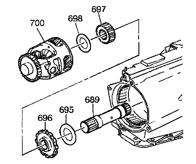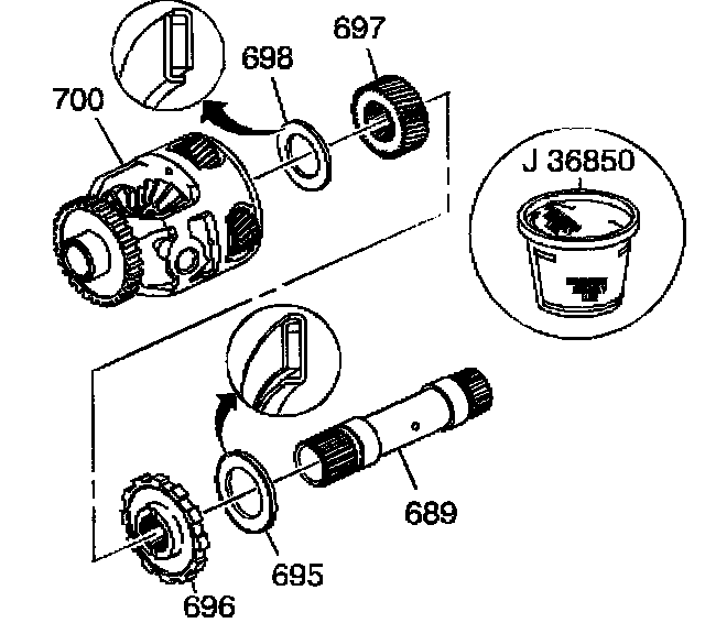 1. Assemble the sun gear thrust bearing (698), the differential carrier sun gear (697), the park gear (696), the internal gear thrust bearing (695) and the sun gear shaft (689) into the differential carrier (700).