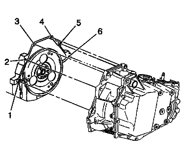 4. Install the lower transaxle bolt (6) and stud (1).