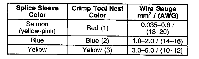 4. Select the proper sealed splice sleeve according to the wire size. Refer to the above table at the beginning of the repair procedure for the color coding of the splice sleeves and the crimp tool nests.
