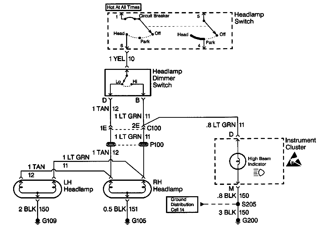 At this point analyze and (diagnose the problem), and develop text. Since the high beam indicator illuminated when the headlamp dimmer switch was in the high position, the high contacts of the headlamp dimmer switch and the LT GRN wire between the headlamp dimmer switch and C100 are good.