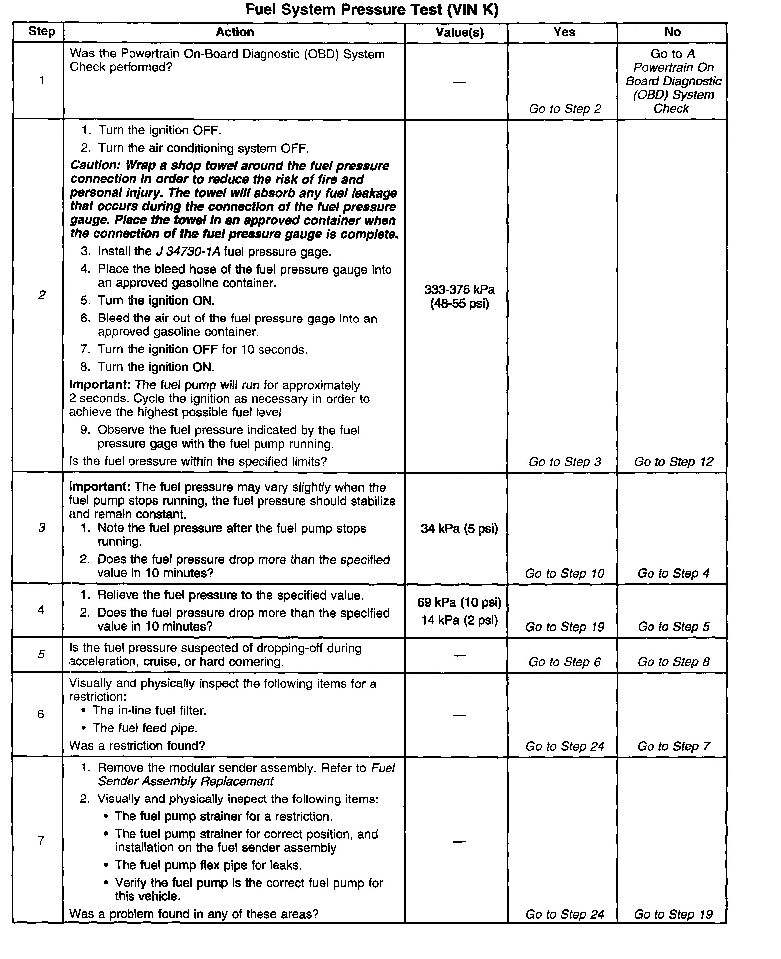 15. A lean condition may result from the fuel pressure being below 333 kPa (48 psi). A lean condition may cause a DTC P0131 or a DTC P0171 to set. Driveability conditions associated with lean conditions can include hard starting (when the engine is cold), hesitation, poor driveability, lack of power, surging, and misfiring.